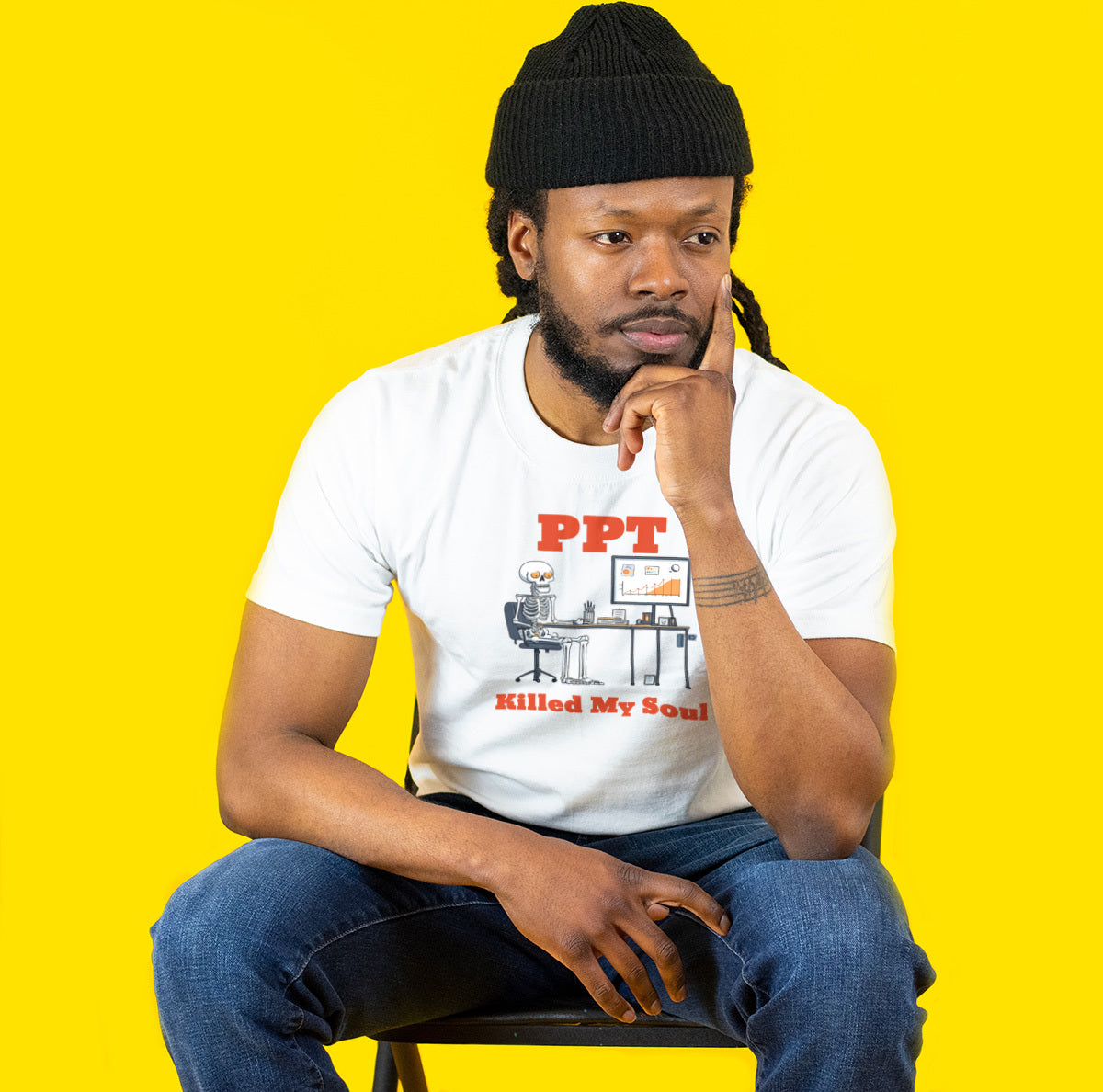 Behold: the corporate casualty. This shirt features a dejected skeleton chained to their laptop, endlessly clicking through PowerPoint slides because PPT killed my soul (and probably yours, too).